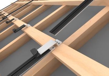 Na střešní latě jsou připevněny svislé AL nosníky. Moduly se vkládají do svislých podpěr, kde jsou upevněny pomocí západkového mechanismu.